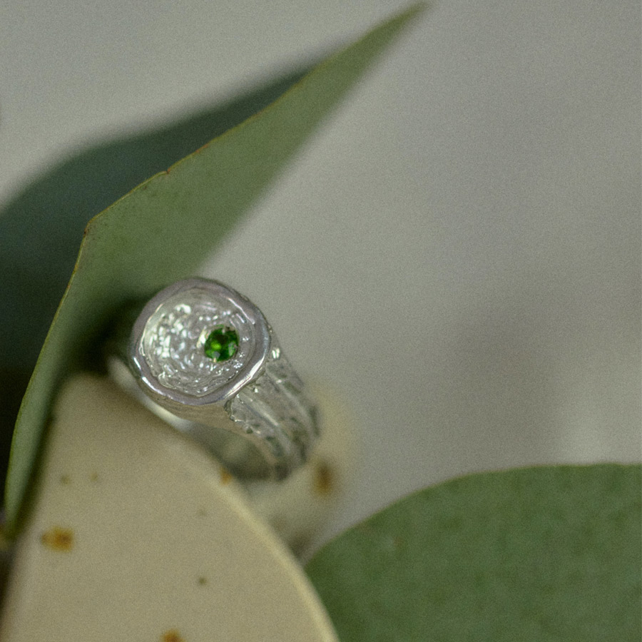 Unico pezzo della collezione a montare una pietra naturale quadrata. Texture irregolare, sempre diversa da un anello all’altro.